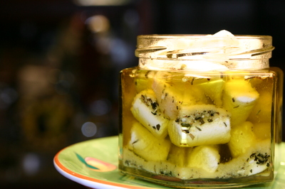 Cover with oil. Put top on jar and refrigerate. Allow to marinate for at least a week for cheese to absorb oil and flavor from herbs and garlic.