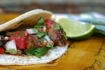 (Note to non meat-eaters: I made a veggie version of carnitas – oxymoron, I know – with diced eggplant seared in a pan, with the Adobo seasonings, salt and lime juice. Wrapped in a corn tortilla with salsa — amazingly good.)