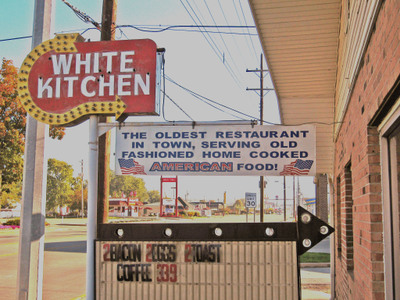 Small, smoky (the non smoking section seemed to consist of two tables next to the kitchen) and filled with people who don’t look like they vote the same way I do, the White Kitchen was the real deal. Home cooked southern Indiana food —  not perfect, but genuine which is sometimes better. I had eggs and American fries and, for the heck of it, some divine fried shoe string onions. Terrific way to start the day.