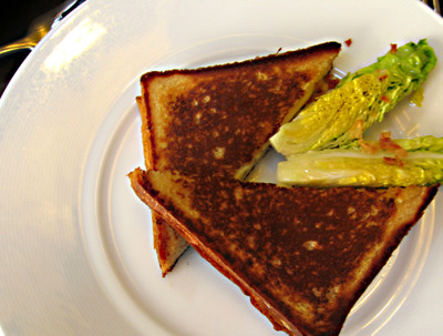 Blogging has kind of shot the hell out of my mornings (trying to make these crappy indoor, night time photos look remotely appetizing is a challenge), so yesterday I didn’t surface until lunch. Loved Le Comptoir so much the first time that we hit it again, meeting a friend there at noon. I had, well, I had a lot of food, no other way to say it. My companions were engaged in a long discussion of political methodology and not being a methodologist myself, all I could do was eat. Croque Monsieur with smoked salmon for starters (and make no mistake, it was a grilled cheese sandwich by any other name – about the amount I would normally have eaten for lunch, all by itself.)
