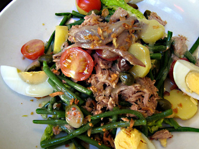 Then a Salade Nicoise – as good a one as I can remember: lettuce, green beans, hard cooked eggs, potatoes, tuna, capers and a few anchovies, all dressed in a tangy vinaigrette. And then dessert. Sigh.  Ice cream – chocolate with piment d’espelette, that smoky paprika from the Basque country (rich creamy chocolate with a warm mouth burn), and caramel fleur de sel (real burnt sugar caramel taste with a good dash of salt.) Wow. It was worth having to listen to a long discussion of about whatever it was about.