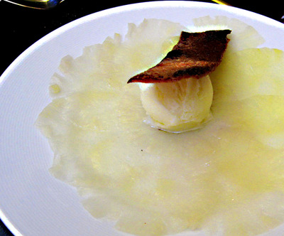 The methodologists had a tranche de pot au feu, along with the same salad I had, and the brandade de morue I’d loved a few days before. For dessert one was wise and had nothing and the other ordered what amounted to pineapple carpaccio, with pineapple sorbet. It looked amazing – pale yellow against the white plate, luscious and luminous. I made him wait while I took a picture, but I am afraid I couldn’t capture the incredible color. Drat.