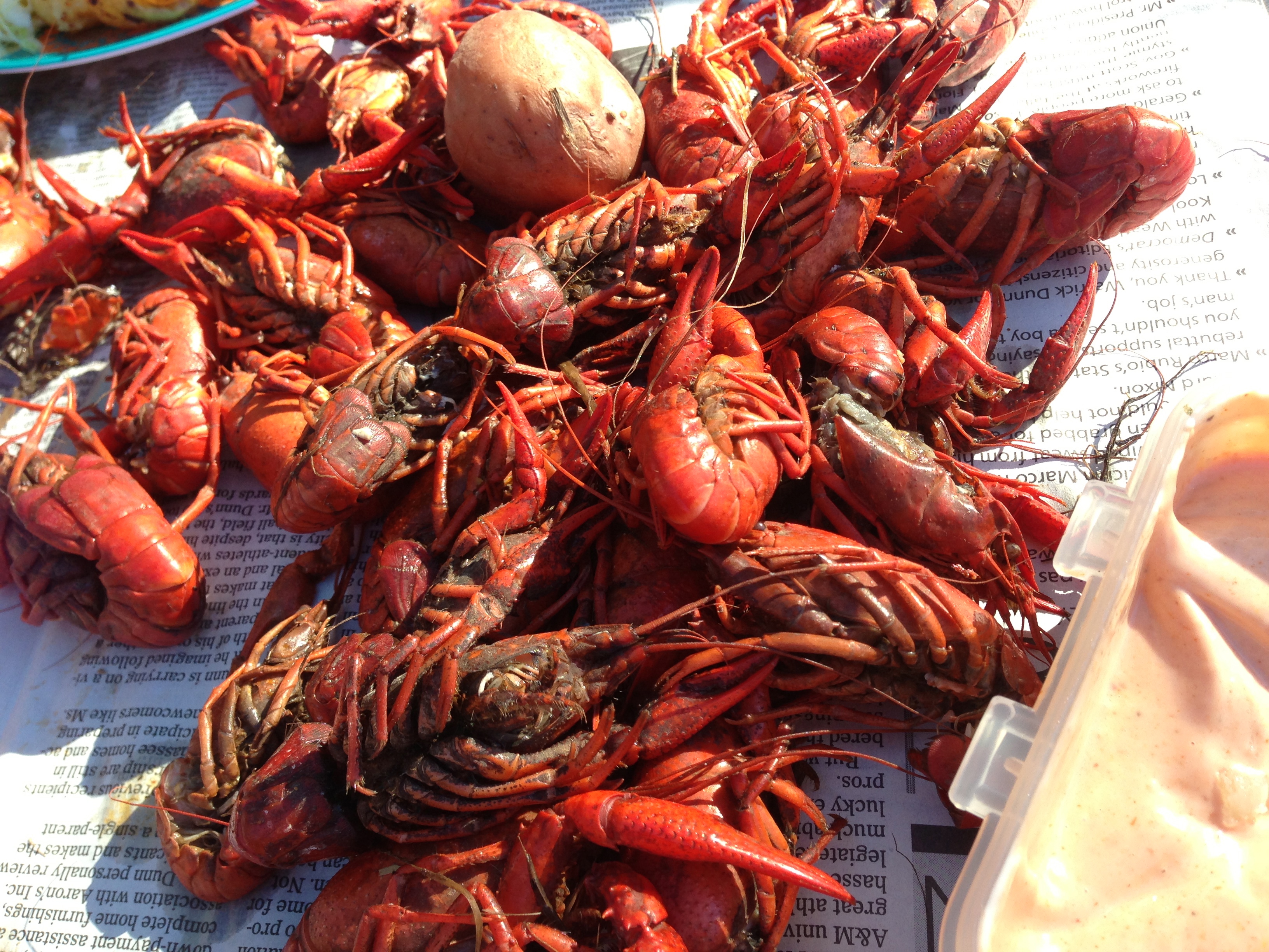 So, anyway, Sunday afternoon, friends brought a seafood feast over to eat on our deck. Trays of oysters, raw, on the half shell, with a dynamite cocktail sauce and roasted with all manner of toppings — cheese, garlic, ginger, capers. No matter how I try I am not an oyster lover, but I am a crawfish lover and there were pounds and pounds of them too, boiled up to a deep red color, and served with a spicy Cajun remoulade.