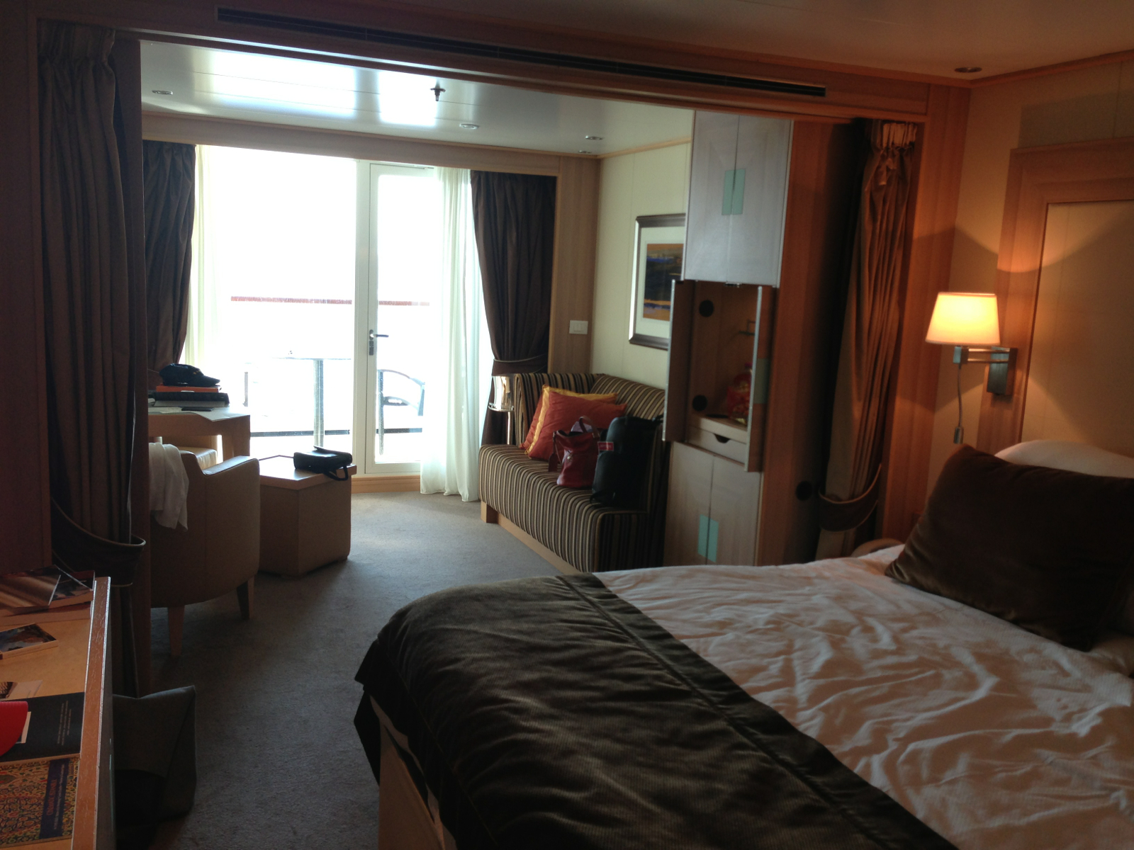 Got to the ship in the afternoon and it is truly lovely. About 450 passengers, a surprising number of whom are kids — I suppose only about a dozen but surprising as there isn’t that much for a kid to do on a Seabourn cruise besides pee in the pool. Several small ones had been set free by their parents to run around the Square (a large central area with comfortable chairs, a coffee shop, and computers.). The staff were as taken aback as the passengers. But the demographic on this ship is definitely younger and more varied than on our Silversea cruise 15 years ago, even if we are older and more staid. It’s nice.