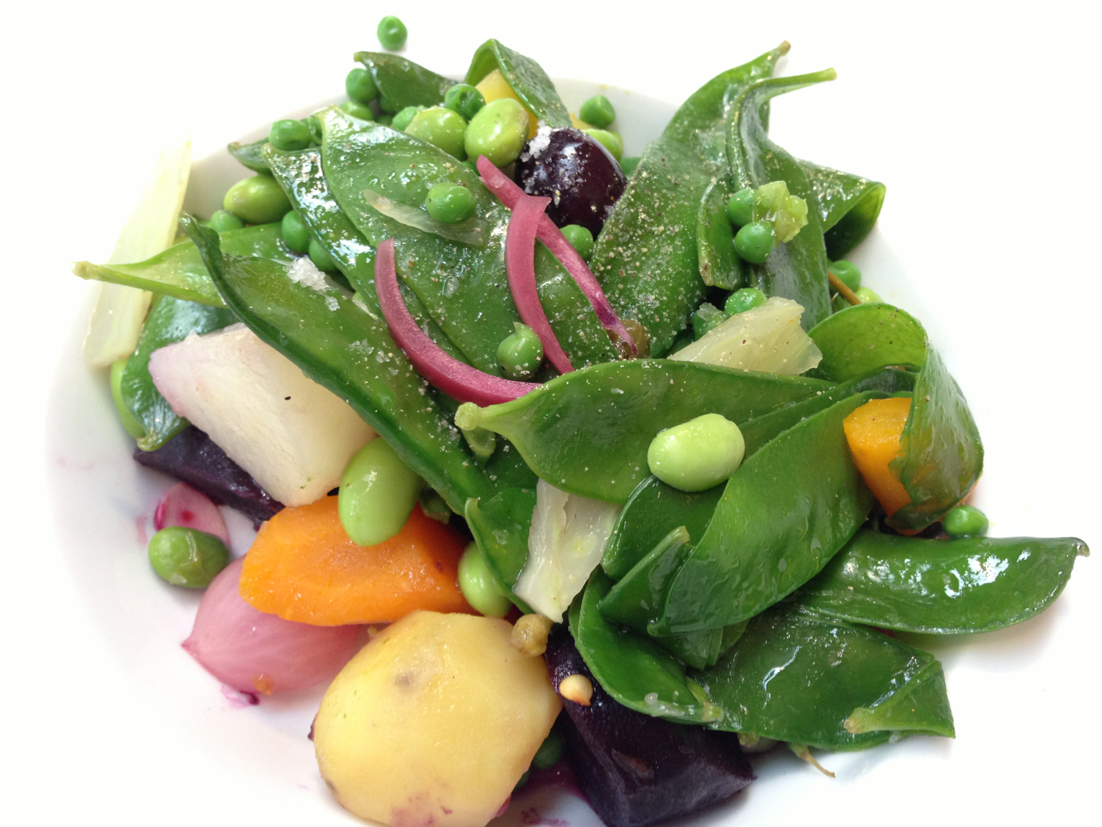 For mains Jerry had a crock of brandade de morue which is one of his favorite things. I had had it there before and it was as good as ever. The salt cod was creamy and rich, full of garlic and potatoes like the ultimate pommes purees with a crispy gratineed top. Fabulous. I had an assiette des legumes figuring that if anyone could do an excellent plate of vegetables, they could. Too right. Snap peas, English peas, fava beans, potatoes, beets, carrots in several colors, turnips, radishes and more of that garlic. A couple of marinated roasted pepper strips and two of the best olives I ever ate. It was just all steamed together in its own juice with pepper and sea salt — the flavor of the vegetables pure and intense.