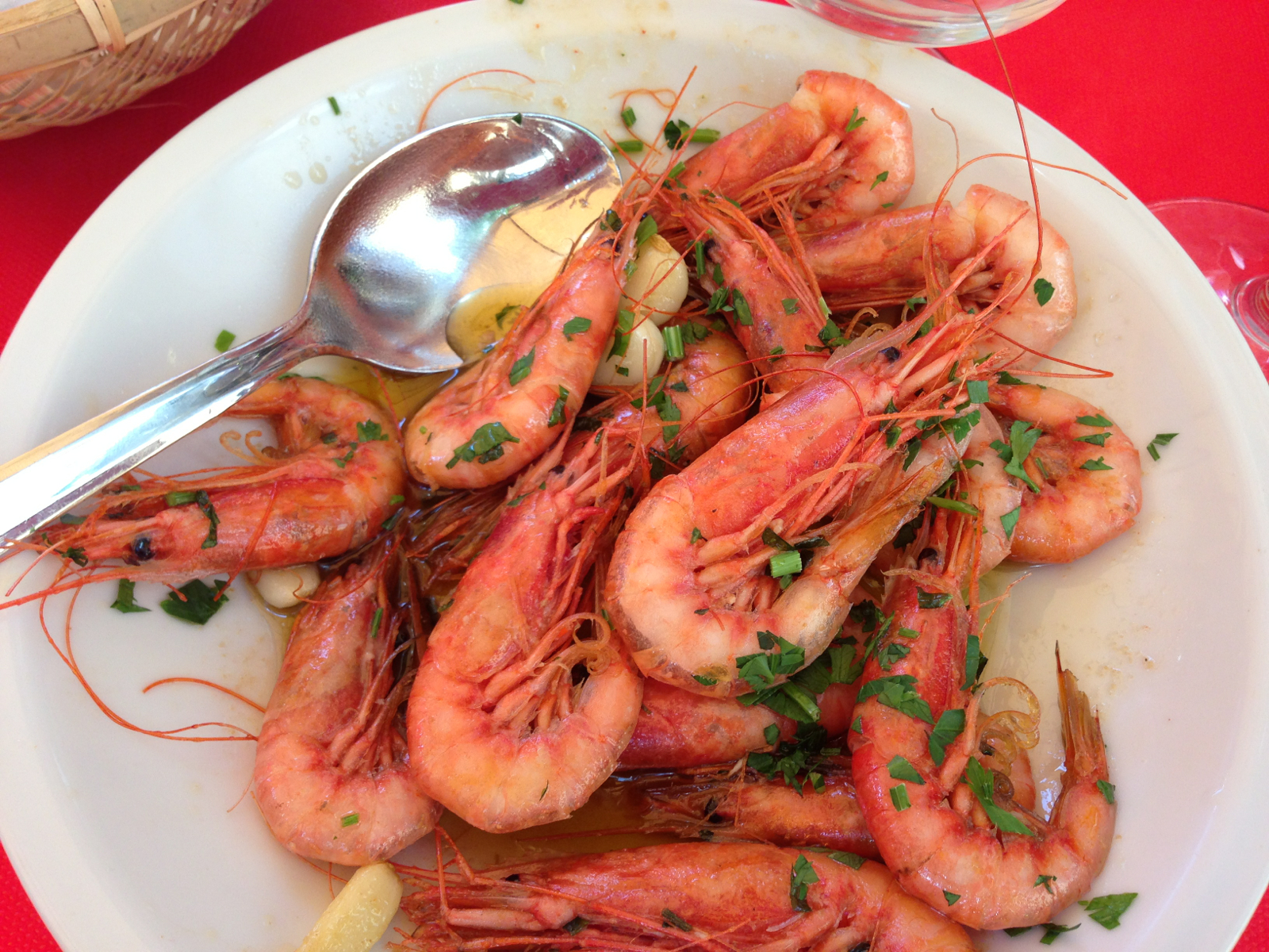 So. The owner poured Jerry a glass of white wine and ran out and bought me a “coke light” from a store next door. We started with a couple of the most enormous oysters I have ever seen and a couple of fat scallops, all raw. Jerry ate those. I had a huge plate of shrimp and they were sensational. I am used to big fat briny gulf shrimp but these were small and sweet and nutty, and as fresh as they could be. I sopped up the considerable oil and confit garlic left in the bowl with a couple of very good crusty rolls.