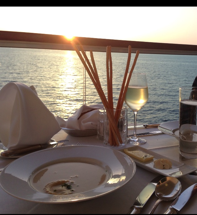 Best of all, on the Seabourn Quest our balcony is bigger and we spend lots of time on it, which is just idyllic. Four of the last ten evenings we have eaten on our veranda because it is so tranquil and the view cannot be beat. They bring up tablecloths and silver and set the same elegant table you ‘d have in the restaurants. All the courses, wine, water, bread, they bring it all in. You eat in a drop dead gorgeous setting with complete privacy. And then they come and clean it all up. What is not to love about that?