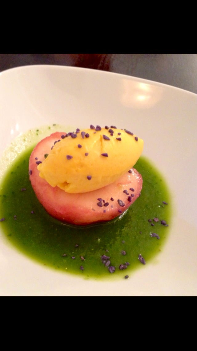 Only I had dessert and it was a winner. Basil soup with a beautiful poached peach half and a scoop of peach sorbet, topped with a deep purple colored crunchy sugar. So light and fresh and summery tasting — just a delight.