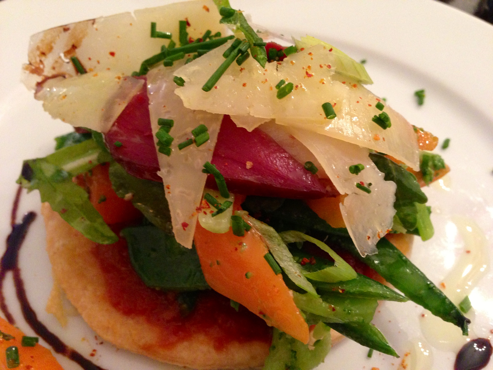 Second courses were, for me, another starter — a tart fine with vegetables, smoked duck and sheep’s cheese. Very nice. Jerry had squid with a risotto of their ink. Tasted great, but by then we had sat a long while and he was, not entirely successfully, fighting off a nap.