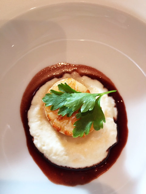 A seared scallop in cauliflower purée.