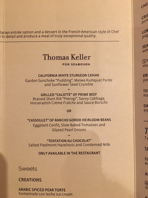 Which brings me to last night. The Restaurant was offering a fixed Chef’s menu (not THE chef, just “a” chef.”) it looked good, but we’d been tuxed and gowned the night before and I was definitely thinking comfort clothes if not comfort food.