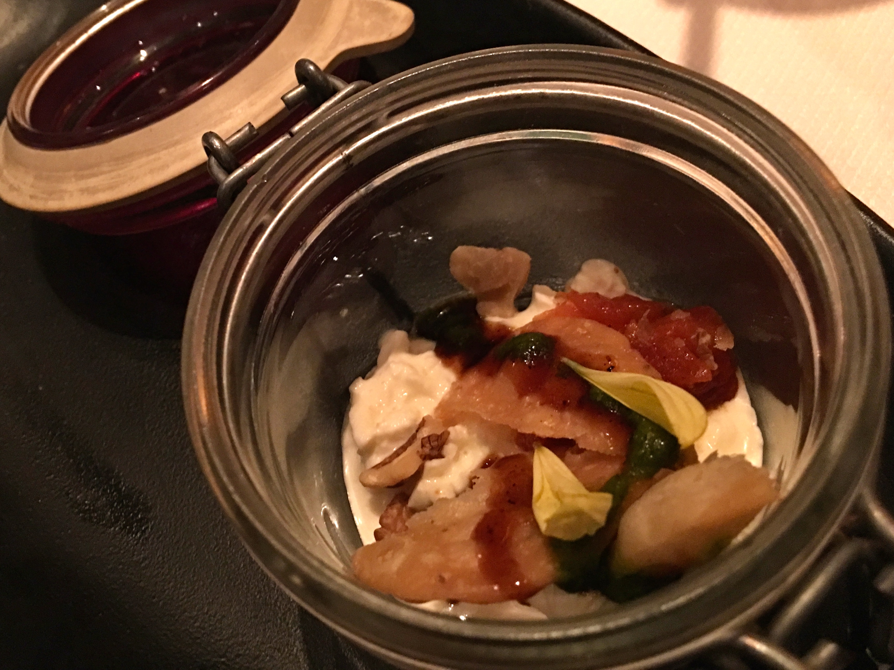 Then came a variation on Indian street food, a way too small mason jar of papdi chaat, exquisite with freaking burrata instead of the yogurt.
