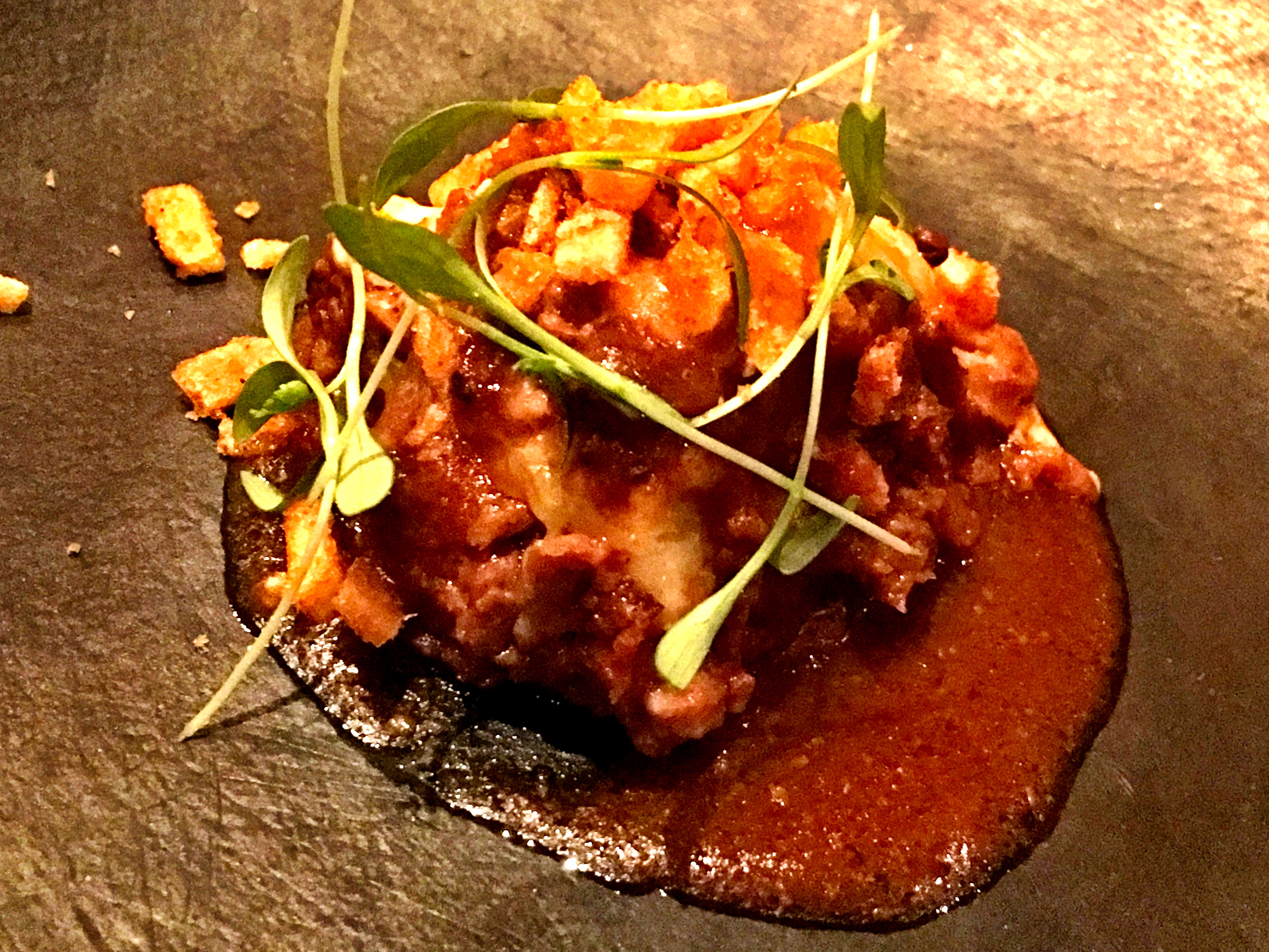 And then potato and soya dish, baked with tiny crunches of chili potato grits. Yup. Grits. Amazingly fabulous. At this point we were still at the stage where we thought we could eat all night. I considered asking for more, but thankfully refrained.