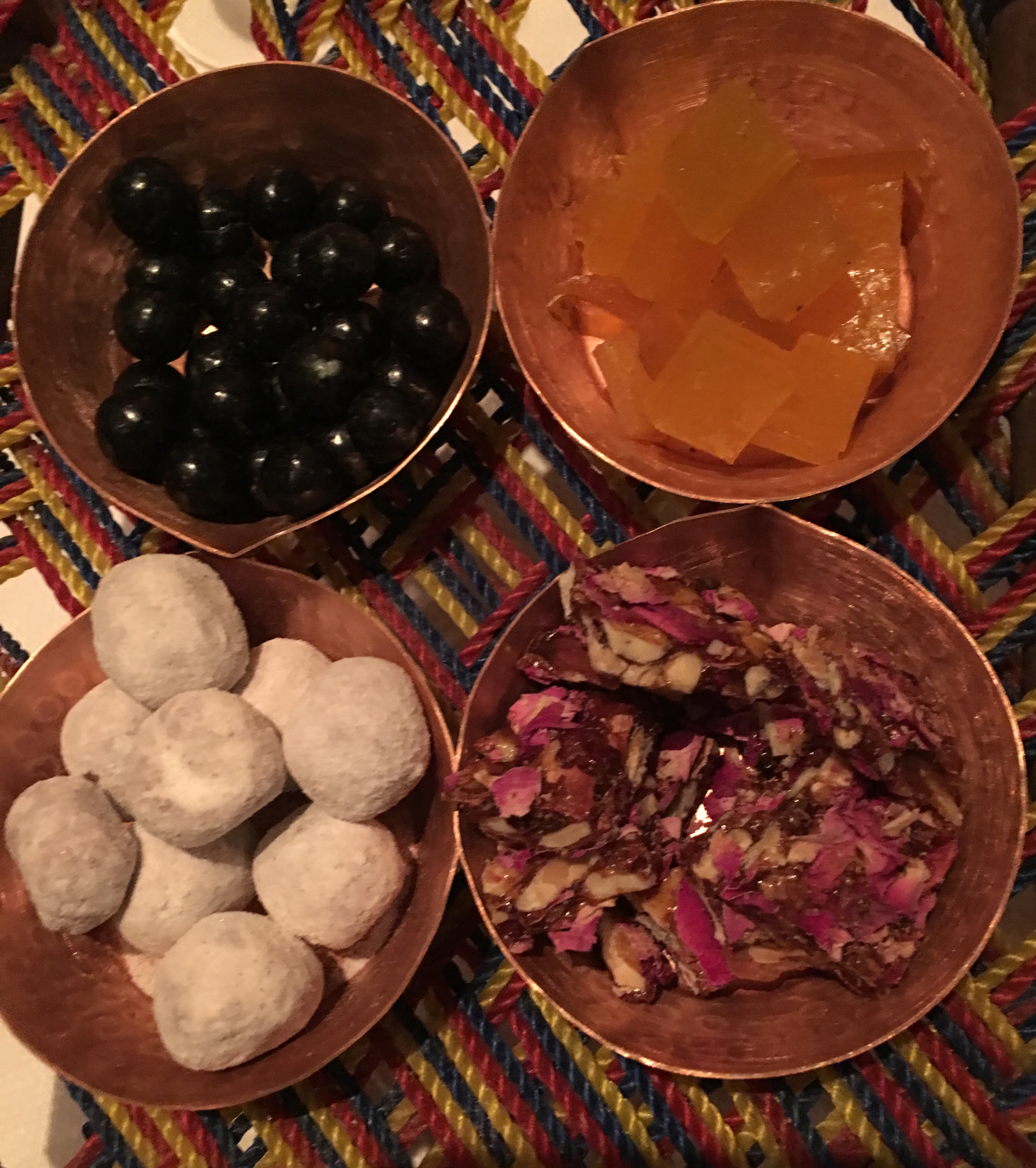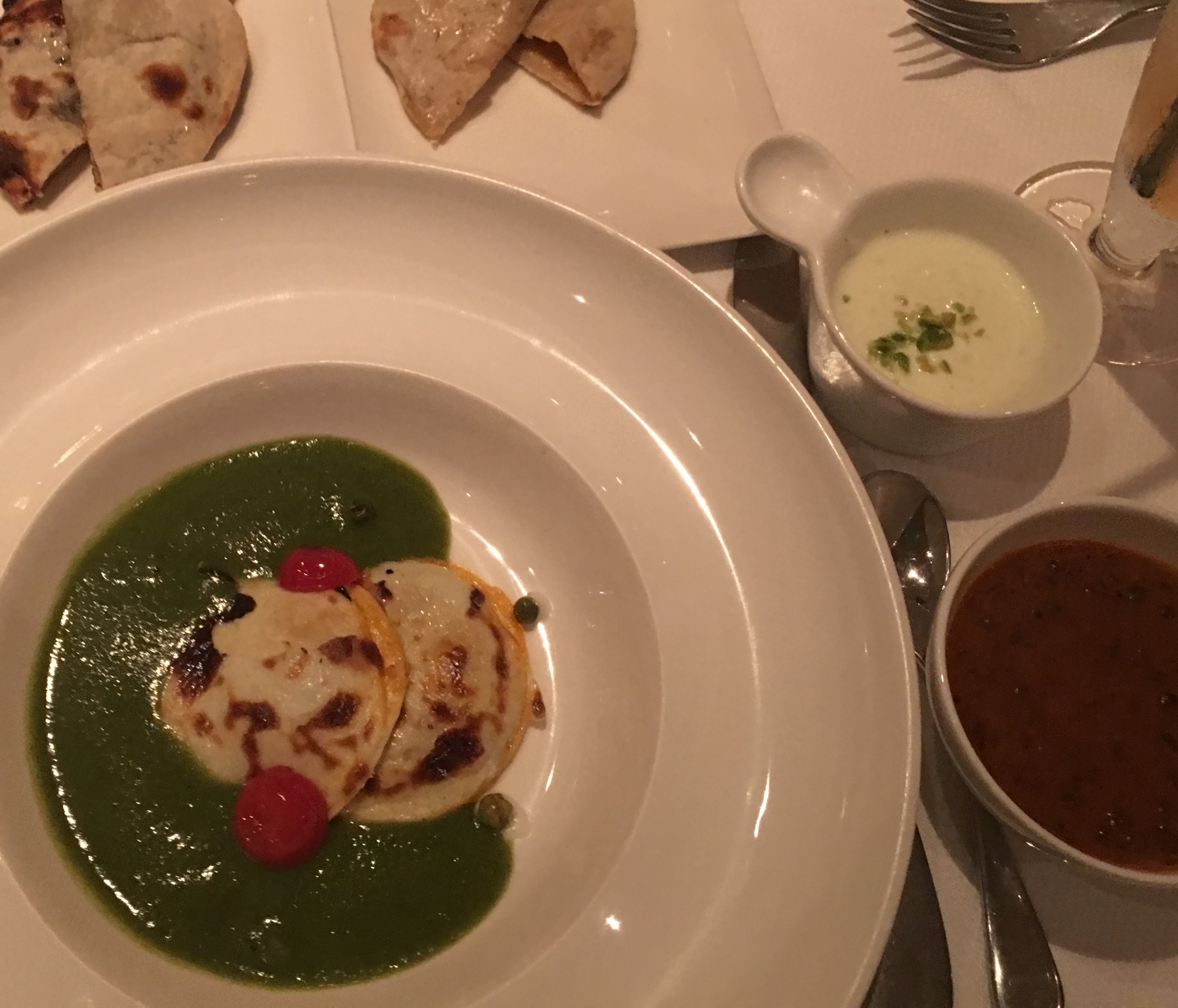 Started with a some bite-sized blue cheese naan and mouthful of cauliflower and turmeric soup in a tiny gorgeous jet black pottery cup. Bouches were all suitably amused.