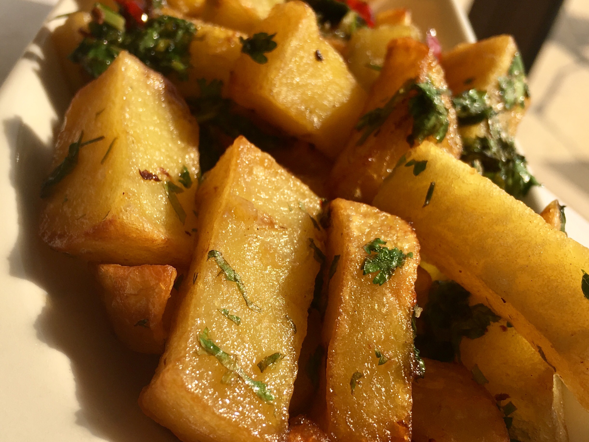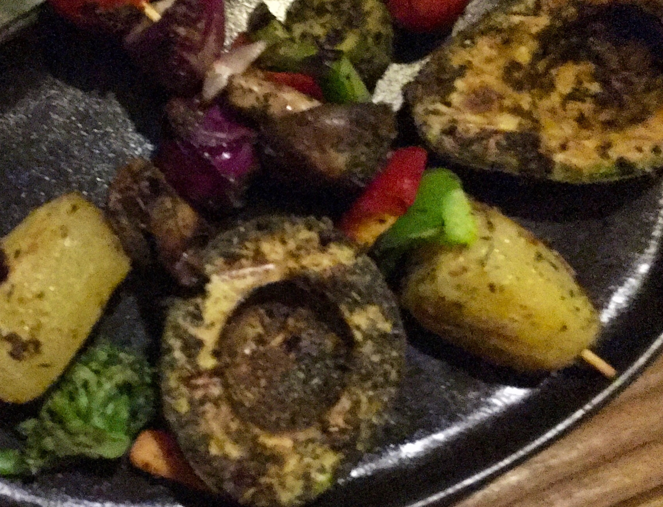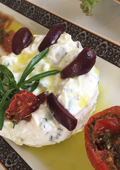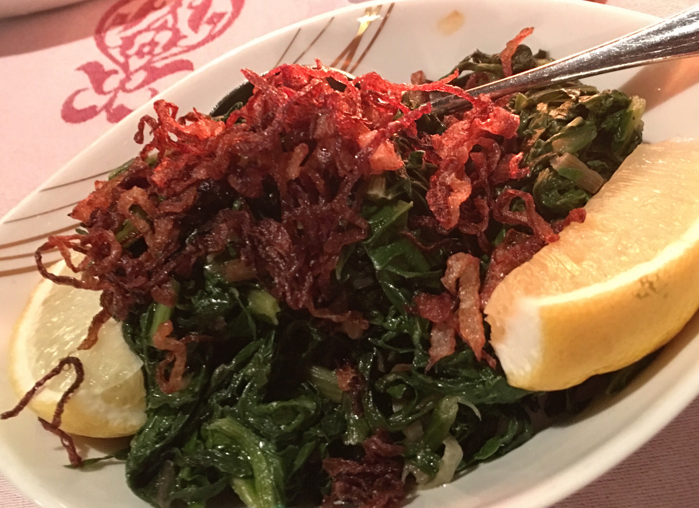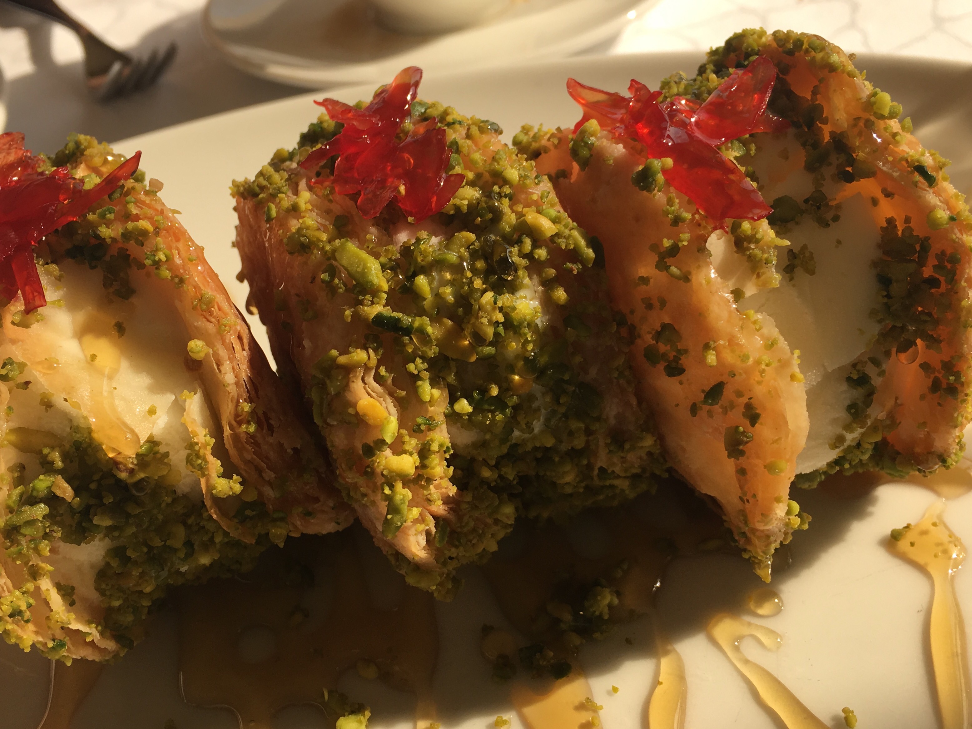 A lot of the standards but also a few fabulous surprises — grilled baby squid on braised chicory with a tangle of fried onions, labne filled with olives and sundried tomatoes, stuffed grape leaves with pomegranate seeds scattered over them like jewels, truly stupendous moutabal, fried potatoes with chiles, cilantro and lemon, and a rose -cented baklava and halava ice cream desert.