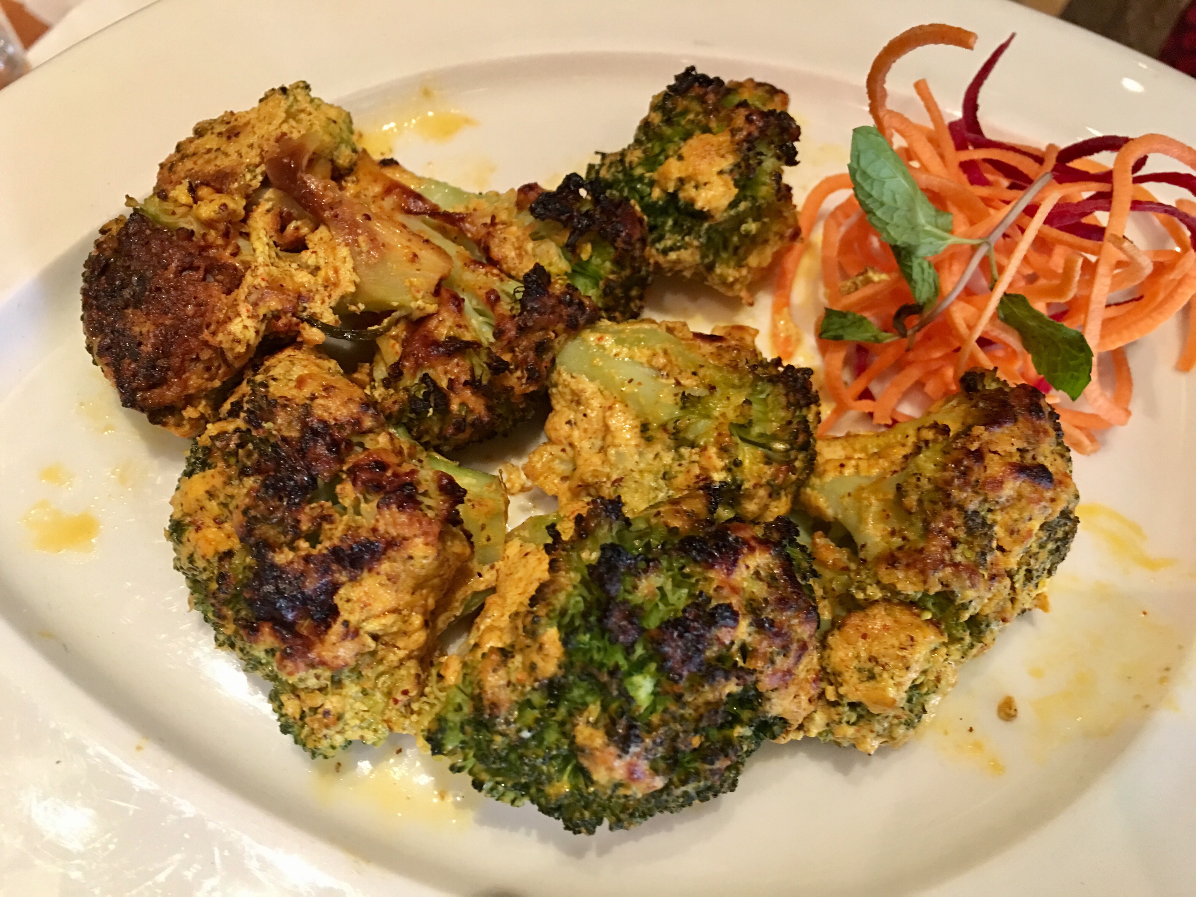 Other starters were mustard-pickled broccoli and grilled paneer cubes.